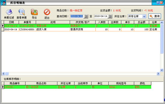 在該窗口中顯示出某種商品在某時間段所有的進出情況。點擊“查找”按鈕打開查找窗口,選擇相應的條件可以更準備的查詢。點擊“查看明細”按鈕可以打開該記錄的詳細情況。