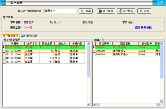 客戶出貨情況:以表格形式在'出貨/退貨記錄'欄內顯示我方與當前客戶發(fā)生的貨品出庫、客戶退貨記錄,在'詳細內容'欄內顯示相應'出貨'或'退貨'記錄所對應的詳細