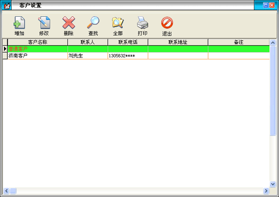 在基本設置模塊中點擊“客戶信息”按鈕打開客戶信息窗口。在窗口中可以看到所有的客戶。點擊“增加”按鈕打開增加客戶窗口,輸入客戶的信息,客戶名稱不能重復。如果該客戶有期初金額則在“期初應收”后輸入相應金額。點擊“修改”按鈕可以修改選中的客戶信息。點擊“刪除”按鈕可以刪除選中的客戶,如果該客戶有業(yè)務發(fā)生則不能刪除。系統(tǒng)有一個“普通客戶”是不能被刪除的。點擊“查找”按鈕打開客戶查詢窗口,輸入相應的條件查詢不同的客戶信息。點擊“全部”按鈕可以列出所有的客戶信息。