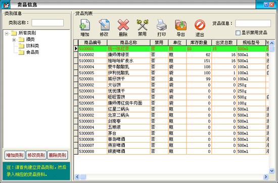 在貨品信息窗口中左邊是貨品類別,右邊列表中是該類別對應的貨品?梢孕略鲱悇e,重命名和刪除類別。新增的類別是屬于所選類別的下一級,如果類別下有貨品存在則該類別是不能被刪除的。在類別名稱后的文本框中可以輸入類別名稱或類別簡碼來查詢需要的類別。