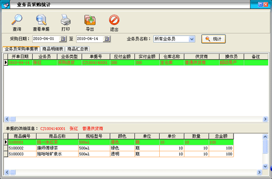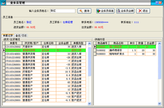 業(yè)務員業(yè)績情況:在'單據(jù)記錄'欄內顯示該業(yè)務員經(jīng)辦的進貨入庫、退貨出庫、貨品出庫、客戶退庫情況,在'詳細內容'欄內顯示相應'進貨'或'出貨'等記錄所對應的詳細