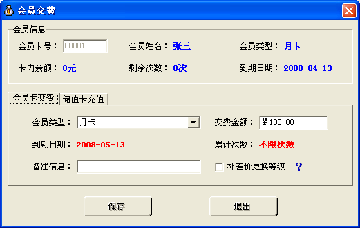 | 如果是會(huì)員卡到期或快到期想繼續(xù)使用,可以使用會(huì)員卡交費(fèi)。如果是會(huì)員想往自己的卡里充值,做為以后購買商品時(shí)使用可以選儲(chǔ)值卡充值。補(bǔ)差價(jià)更換等級的功能是:如果選中該功能,更換會(huì)員等級時(shí),只需補(bǔ)交兩個(gè)等級的差價(jià)就可以換成新的等級,截止日期會(huì)根據(jù)開卡日期重新計(jì)算,累計(jì)次數(shù)也會(huì)重新計(jì)算,適合更換會(huì)員等級的會(huì)員。如果不選中該功能,,截止日期會(huì)在以前的截止日期上累加.適合續(xù)費(fèi)的會(huì)員。 |