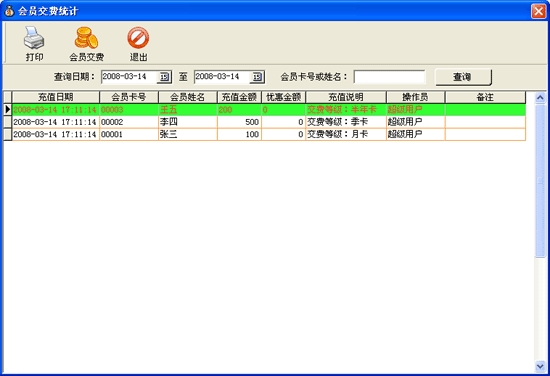 | 在窗口中可以根據(jù)日期顯示出相應(yīng)會(huì)員充值的情況。 |