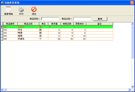 | 在該窗口中會(huì)顯示出所有商品的庫存情況,用戶可以根據(jù)商品類別或商品名稱來過濾不同的商品信息。點(diǎn)擊“查看明細(xì)”可以查看當(dāng)前選中商品的進(jìn)貨、退貨、銷售等詳細(xì)情況。 |