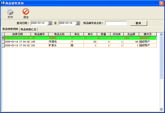 | 在該窗口中會(huì)顯示出所有商品的商品銷售明細(xì)和匯總情況,用戶可以根據(jù)查詢?nèi)掌凇⑸唐肪幪柣蛎Q來過濾不同的銷售信息。 |