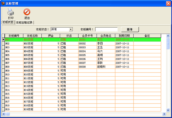 | 在衣柜管理中主要分衣柜狀態(tài)和衣柜出租記錄。衣柜狀態(tài)顯示的是當(dāng)前所有衣柜的狀態(tài),如果是已租則顯示出是哪個(gè)會(huì)員租了,截止日期到什么時(shí)間。 |
