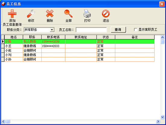 | 該功能主要是管理所有員工的信息,包括員工姓名、職務(wù)、聯(lián)系電話、聯(lián)系地址、狀態(tài)、備注信息。 |