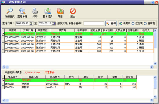業(yè)務(wù)員業(yè)績情況:以表格形式在'單據(jù)記錄'欄內(nèi)顯示該業(yè)務(wù)員經(jīng)辦的采購、采購?fù)素、客戶付款記錄、商品銷售、銷售退貨、客戶付款情況,在'詳細(xì)內(nèi)容'欄內(nèi)顯示相應(yīng)'采購'或'銷售'等記錄所對應(yīng)的詳細(xì)商品信息;