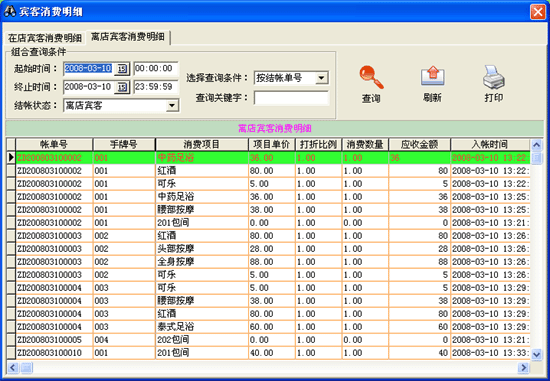 | 4、結(jié)賬狀態(tài)查詢:功能 用分類查詢結(jié)賬賓客、掛賬賓客、免費賓客、退單賓客的消費情況。(注:主要為了分類統(tǒng)計已離店賓客的結(jié)賬狀態(tài)) | |||