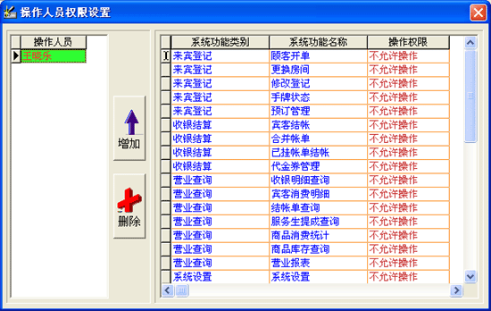 | ·點擊菜單“系統(tǒng)維護(hù)→操作權(quán)限”進(jìn)入操作權(quán)限設(shè)置界面。 ·進(jìn)入“操作人員權(quán)限設(shè)置”窗口中,如需增加操作人員,請點擊“增加”按鈕,錄入操作人員名稱和操作密碼,注意操作人員名稱不能相同。 ·如需刪除某操作人員,請點擊“刪除”按鈕。 ·系統(tǒng)默認(rèn)操作人員所有權(quán)限為“不允許操作”,如允許某項操作,請點擊該項“不允許操作”,顯示“是否允許操作”前點擊打勾即可。 |