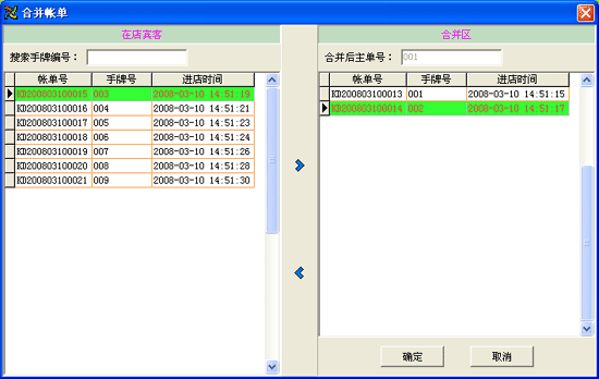 | ·通過點擊主窗口中的菜單“收銀結(jié)賬→合并賬單”進(jìn)入合并賬單界面。 ·在“在店賓客”列表框內(nèi)移動光標(biāo)或直接用鼠標(biāo)指定客人,也可在“指定手牌后”的文本框內(nèi)輸入賓客手牌編號迅速查找定位相關(guān)賓客。 ·在“在店賓客”列表框內(nèi)按回車鍵或雙擊鼠標(biāo)或按帶有向右方向箭頭的按鈕,將當(dāng)前光標(biāo)所指的賓客記錄移動到“合并區(qū)”列表框;可添加多個手牌到合并區(qū),方法同上。帶有向左方向箭頭的按鈕與帶有向右方向箭頭的按鈕的作用相反。 ·在“合并區(qū)”內(nèi)移動光標(biāo),可選擇確定合并后以哪個手牌作為合并后的主單。 ·按“確定”按鈕完成合并操作,反之按“取消”按鈕則取消合并操作。 |