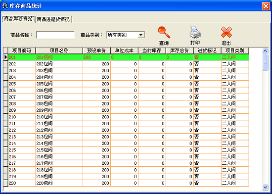 | ·點擊菜單“營業(yè)查詢→商品庫存查詢”進(jìn)入“商品庫存查詢”界面。 ·進(jìn)入“商品消費統(tǒng)計”窗口后,分為“商品庫存情況”和“商品進(jìn)退貨情況”兩頁。系統(tǒng)默認(rèn)顯示在數(shù)據(jù)表中的數(shù)據(jù)為所有商品庫存情況。可以選擇商品類別或輸入需查詢的商品名稱后點擊查詢按鈕,數(shù)據(jù)表中將顯示符合條件的商品庫存情況。“商品進(jìn)退貨情況”窗口操作同上。 ·點擊打印按鈕可將數(shù)據(jù)表中的數(shù)據(jù)打印到已連接并能正常工作的打印機(jī)上。 |