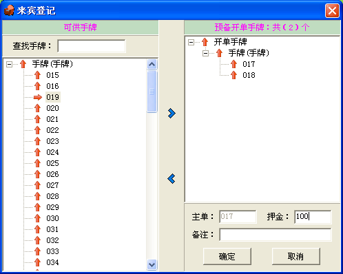 ·在選定某一處于“可供”狀態(tài)的手牌后,通過點擊菜單“來賓登記→顧客開單”(或直接點擊主窗口中的“顧客開單” 快捷按鈕)菜單進(jìn)入顧客開單界面。 ·進(jìn)入“顧客開單”界面后,可以看到各個包間的可供手牌和相關(guān)費用。 ·填寫押金金額(根椐本店情況而定)。 ·填寫完之后,點擊 “確定” 按鈕將完成開單任務(wù),點擊“取消”按鈕將取消此次開單操作。 |