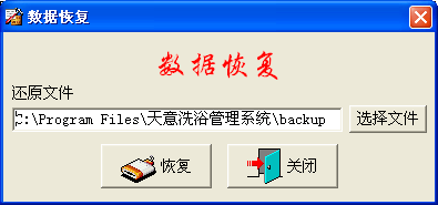 | ·點擊菜單“系統(tǒng)維護(hù)→數(shù)據(jù)恢復(fù)”進(jìn)入數(shù)據(jù)恢復(fù)界面。 ·系統(tǒng)默認(rèn)備份路徑是當(dāng)前文件夾下的backup,如恢復(fù)其它路徑中的備份文件,可點擊“選擇文件”按鈕來更改恢復(fù)路徑,點擊“恢復(fù)”按鈕進(jìn)行數(shù)據(jù)恢復(fù)。 |