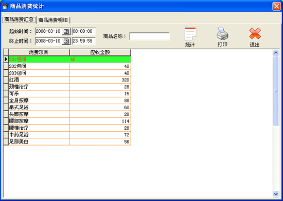 | ·點擊菜單“營業(yè)查詢→商品消費統(tǒng)計”進(jìn)入“商品消費統(tǒng)計”界面。 ·進(jìn)入“商品消費統(tǒng)計”窗口后,分為“商品消費匯總”和“商品消費明細(xì)”兩頁。系統(tǒng)默認(rèn)顯示在數(shù)據(jù)表中的數(shù)據(jù)為月初至當(dāng)天的消費匯總情況?梢栽跁r間范圍中指定特定的時間并輸入商品名稱后點擊查詢按鈕,數(shù)據(jù)表中將顯示符合條件的消費情況。“商品消費明細(xì)”窗口操作同上。 ·點擊打印按鈕可將數(shù)據(jù)表中的數(shù)據(jù)打印到已連接并能正常工作的打印機(jī)上。 |