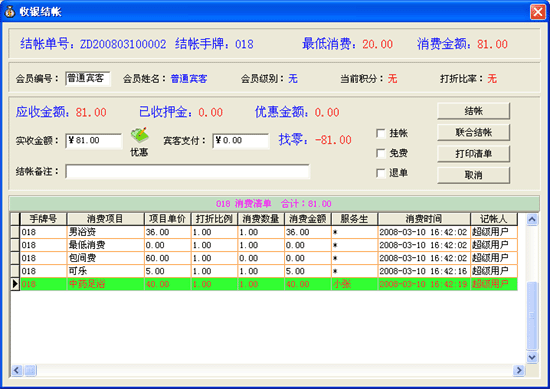 本模塊將自動統(tǒng)計每個登記客人在店時所發(fā)生的所有消費額和應(yīng)付款額,并完成結(jié)帳收銀操作。