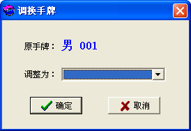 | ·在選定需要更換的手牌后, 通過點擊菜單“來賓登記→更換包間”進(jìn)入更換包間界面。 ·進(jìn)入“更換手牌”界面后可以看到當(dāng)前待調(diào)換的手牌號(即:原手牌),在“調(diào)整為”后的下拉框中選擇要調(diào)整到的目標(biāo)手牌。 ·選擇之后,點擊“確定”按鈕將完成更換手牌任務(wù),點擊“取消”按鈕將取消此次更換手牌操作。 |
