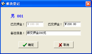 通過點擊菜單“來賓登記→修改登記”進(jìn)入修改登記界面。 ·進(jìn)入修改登記界面后,相應(yīng)的文框?qū)@示出顧客登記時的數(shù)據(jù),更改需要修改的項目。如:押金金額。 ·填寫完之后,點擊“確定”按鈕將完成修改任務(wù),點擊“取消”按鈕將取消此次修改操作。 |