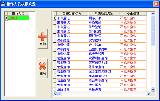 | ·點(diǎn)擊菜單“系統(tǒng)維護(hù)→操作權(quán)限”進(jìn)入操作權(quán)限設(shè)置界面。 ·進(jìn)入“操作人員權(quán)限設(shè)置”窗口中,如需增加操作人員,請(qǐng)點(diǎn)擊“增加”按鈕,錄入操作人員名稱和操作密碼,注意操作人員名稱不能相同。 ·如需刪除某操作人員,請(qǐng)點(diǎn)擊“刪除”按鈕。 ·系統(tǒng)默認(rèn)操作人員所有權(quán)限為“不允許操作”,如允許某項(xiàng)操作,請(qǐng)點(diǎn)擊該項(xiàng)“不允許操作”,顯示“是否允許操作”前點(diǎn)擊打勾即可。 |