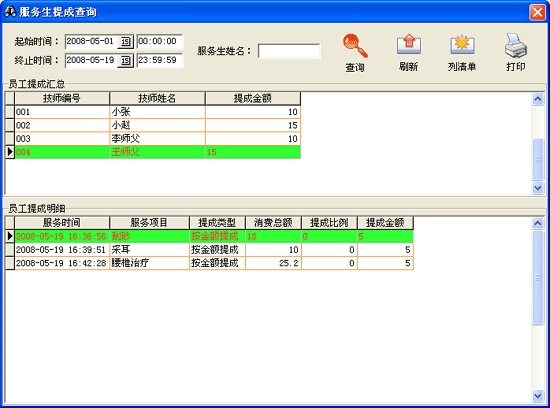 此模塊完成服務(wù)生提成明細(xì)和提成匯總的功能可打印。(前提:在系統(tǒng)設(shè)置中已設(shè)置好了服務(wù)項(xiàng)目提成金額,設(shè)置方法參考“系統(tǒng)設(shè)置”模塊。)