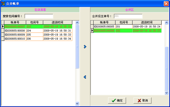 | ·通過點(diǎn)擊主窗口中的菜單“收銀結(jié)賬→合并賬單”進(jìn)入合并賬單界面。 ·在“在店賓客”列表框內(nèi)移動(dòng)光標(biāo)或直接用鼠標(biāo)指定客人,也可在“指定包間后”的文本框內(nèi)輸入賓客包間編號(hào)迅速查找定位相關(guān)賓客。 ·在“在店賓客”列表框內(nèi)按回車鍵或雙擊鼠標(biāo)或按帶有向右方向箭頭的按鈕,將當(dāng)前光標(biāo)所指的賓客記錄移動(dòng)到“合并區(qū)”列表框;可添加多個(gè)包間到合并區(qū),方法同上。帶有向左方向箭頭的按鈕與帶有向右方向箭頭的按鈕的作用相反。 ·在“合并區(qū)”內(nèi)移動(dòng)光標(biāo),可選擇確定合并后以哪個(gè)包間作為合并后的主單。 ·按“確定”按鈕完成合并操作,反之按“取消”按鈕則取消合并操作。 |