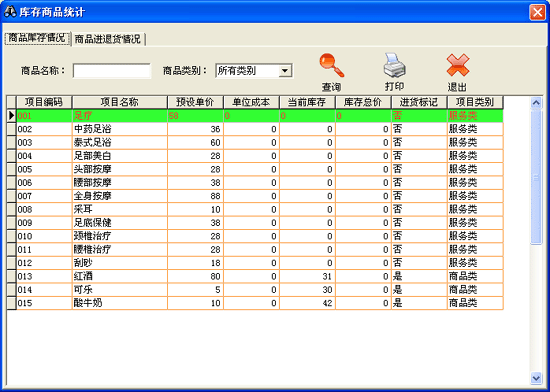 | ·點(diǎn)擊菜單“營(yíng)業(yè)查詢→商品庫(kù)存查詢”進(jìn)入“商品庫(kù)存查詢”界面。 ·進(jìn)入“商品消費(fèi)統(tǒng)計(jì)”窗口后,分為“商品庫(kù)存情況”和“商品進(jìn)退貨情況”兩頁。系統(tǒng)默認(rèn)顯示在數(shù)據(jù)表中的數(shù)據(jù)為所有商品庫(kù)存情況。可以選擇商品類別或輸入需查詢的商品名稱后點(diǎn)擊查詢按鈕,數(shù)據(jù)表中將顯示符合條件的商品庫(kù)存情況。“商品進(jìn)退貨情況”窗口操作同上。 ·點(diǎn)擊打印按鈕可將數(shù)據(jù)表中的數(shù)據(jù)打印到已連接并能正常工作的打印機(jī)上。 |