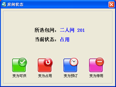 此項(xiàng)操作可手動(dòng)修改處于非占用狀態(tài)的包間狀態(tài)為”可供”、“預(yù)訂”、“停用”等狀態(tài)。