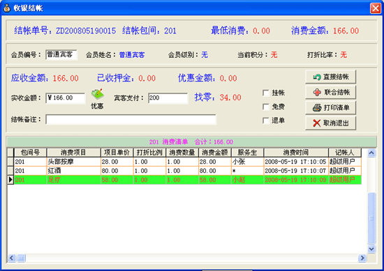 本模塊將自動(dòng)統(tǒng)計(jì)每個(gè)登記客人在店時(shí)所發(fā)生的所有消費(fèi)額和應(yīng)付款額,并完成結(jié)帳收銀操作。