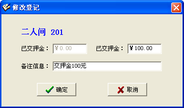 通過點(diǎn)擊菜單“來賓登記→修改登記”進(jìn)入修改登記界面。 ·進(jìn)入修改登記界面后,相應(yīng)的文框?qū)@示出顧客登記時(shí)的數(shù)據(jù),更改需要修改的項(xiàng)目。如:押金金額。 ·填寫完之后,點(diǎn)擊“確定”按鈕將完成修改任務(wù),點(diǎn)擊“取消”按鈕將取消此次修改操作。 |