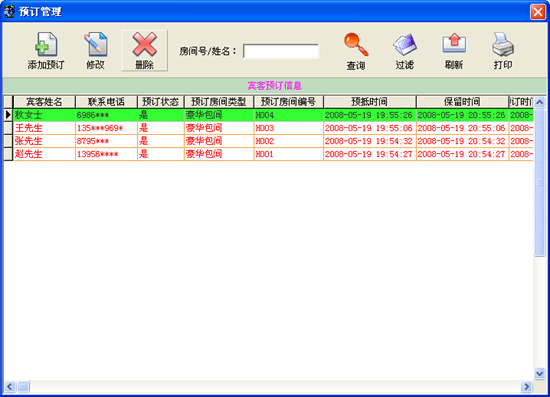 此項(xiàng)功能可以完成增加預(yù)訂、修改預(yù)訂、刪除預(yù)訂,預(yù)訂情況的查詢、打印等功能。