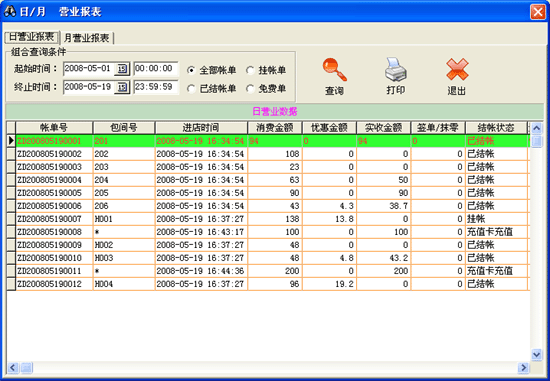 | ·點(diǎn)擊菜單“營(yíng)業(yè)查詢→結(jié)賬狀態(tài)查詢”進(jìn)入結(jié)賬狀態(tài)查詢界面。 ·在“賬單號(hào)“后的文本框中輸入賬單號(hào)后,點(diǎn)擊查詢按鈕在本窗口的數(shù)據(jù)表中將顯示對(duì)應(yīng)賬單的消費(fèi)信息,點(diǎn)擊“列清單”可把當(dāng)前選定賬單的消費(fèi)清單顯示在打印預(yù)覽窗口中。 ·點(diǎn)擊“刷新”按鈕,數(shù)據(jù)表將顯示所有已離店賓客的結(jié)賬狀態(tài)。 ·點(diǎn)擊“打印”按鈕,可將當(dāng)前數(shù)據(jù)表中顯示的數(shù)據(jù)打印輸出到已連接并能正常工作的打印機(jī)上。 |