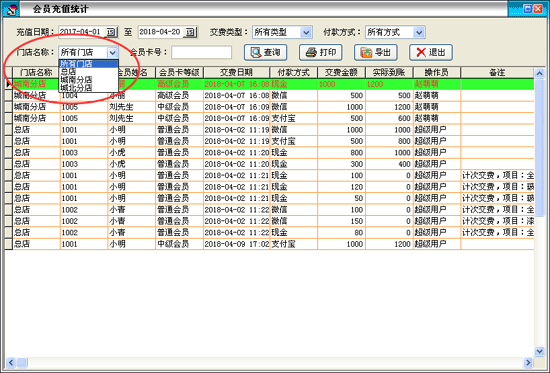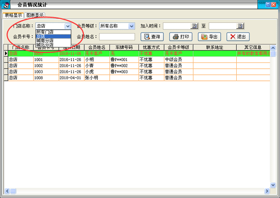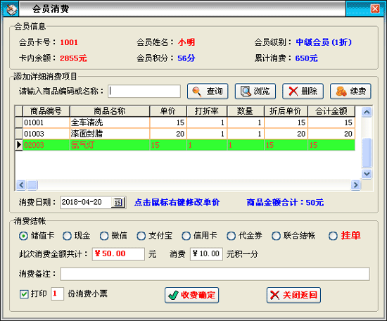 消費開單:對會員消費情況進行錄入,自動完成累計積分,消費打折。也可以增加會員消費商品的詳細信息。