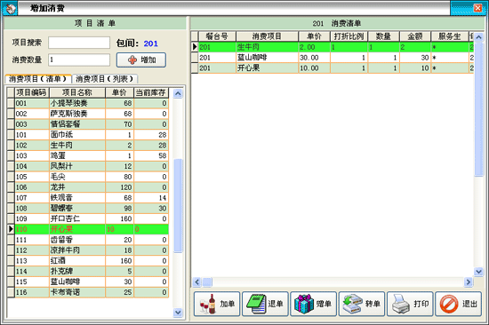 | 點(diǎn)單消費(fèi)→增加消費(fèi):客人在消費(fèi)過(guò)程中所消費(fèi)的所有項(xiàng)目均要進(jìn)行入帳處理,以便在客人離店時(shí)自動(dòng)計(jì)算消費(fèi)額。客人的消費(fèi)明細(xì)便是在此入帳。 | |||