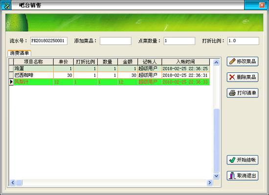 | 點(diǎn)單消費(fèi)→增加消費(fèi):客人在消費(fèi)過程中所消費(fèi)的所有項(xiàng)目均要進(jìn)行入帳處理,以便在客人離店時(shí)自動(dòng)計(jì)算消費(fèi)額。客人的消費(fèi)明細(xì)便是在此入帳。 | |||
