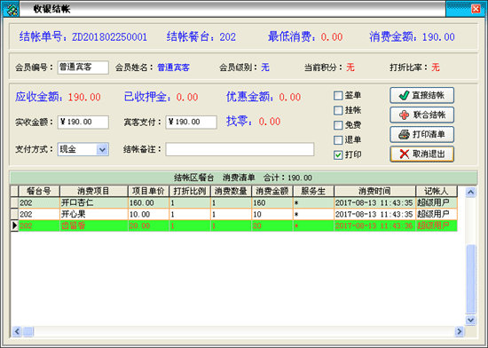 | 收銀結(jié)賬→賓客結(jié)帳:終結(jié)客戶當(dāng)前的消費(fèi)活動(dòng),并進(jìn)行收款及自動(dòng)還原包廂項(xiàng)目(手牌)的占用狀態(tài)為可供狀態(tài)。 | |||