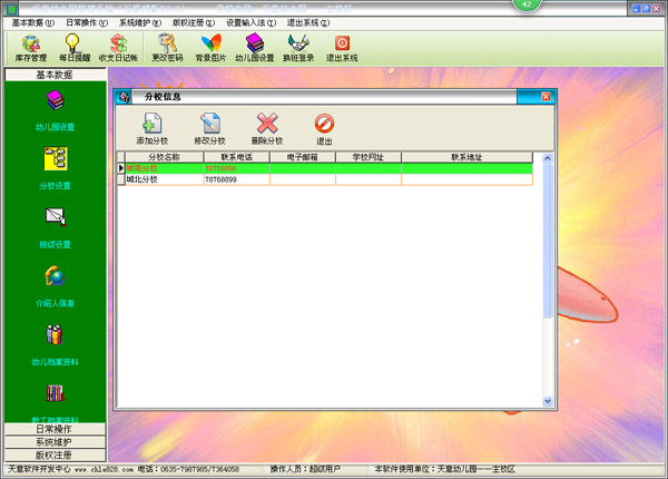 | 1、基本設置:對本軟件一些基本信息的設置,包括有:幼兒園設置、分校設置、班級設置、介紹人設置、幼兒檔案資料、教工檔案資料等設置。 | |||