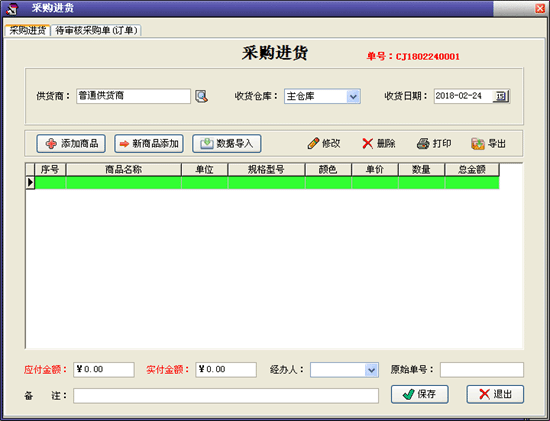 | 進(jìn)貨管理:進(jìn)行商品采購(gòu)入庫(kù),采購(gòu)?fù)素?進(jìn)/退單據(jù)和當(dāng)前庫(kù)存查詢(xún),與供貨商的往來(lái)帳務(wù)。 | |||