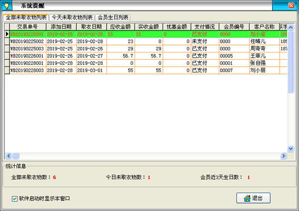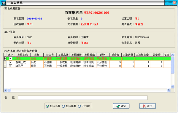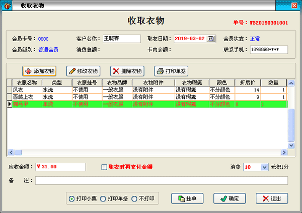 | 收取衣物:接收客戶的預(yù)洗衣物,根據(jù)要求和提示輸入衣物相關(guān)信息。如果是會(huì)員,您可以直接刷卡,并顯示出該會(huì)員的相關(guān)信息(會(huì)員卡余額,消費(fèi)總額,聯(lián)系電話等)。 | |||
