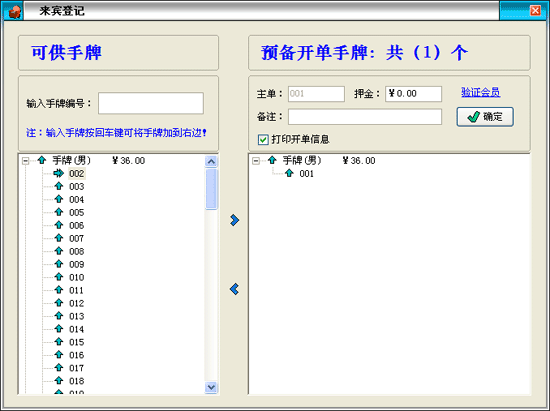 | 手牌:手牌可分為男賓手牌和女賓手牌,每個手牌就具體到某一來店登記的賓客,一般把手牌提供給一個客人后,在當(dāng)前客人未退出占用狀態(tài)前暫時無法提供給另一個客人消費。此項目在系統(tǒng)設(shè)置中設(shè)置,在賓客開單時使用。