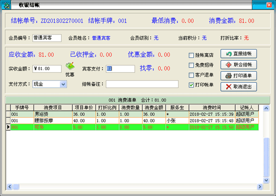 第 二 步、點單模塊:點單消費→增加消費 第 三 步、收銀模塊:收銀結(jié)帳→賓客結(jié)帳 |