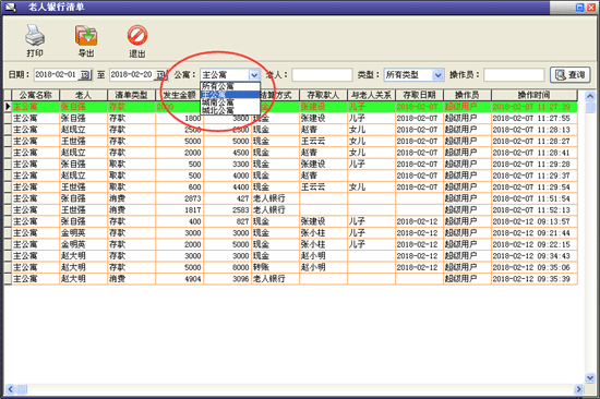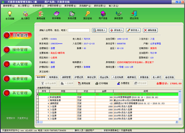 | 4、收費管理:主要包括費用結(jié)算及續(xù)費、備用金繳費、入住繳費、退住結(jié)款、現(xiàn)金記賬、老人銀行清單、繳費明細查詢、老人欠費清單等內(nèi)容。 | |||