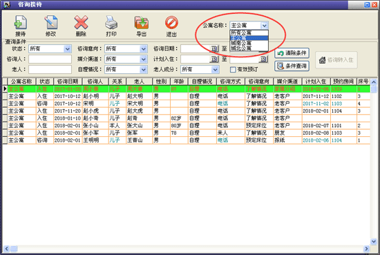 | 2、接待管理:主要包括咨詢接待、來訪登記、床位查詢、老人查詢等內(nèi)容。 | |||