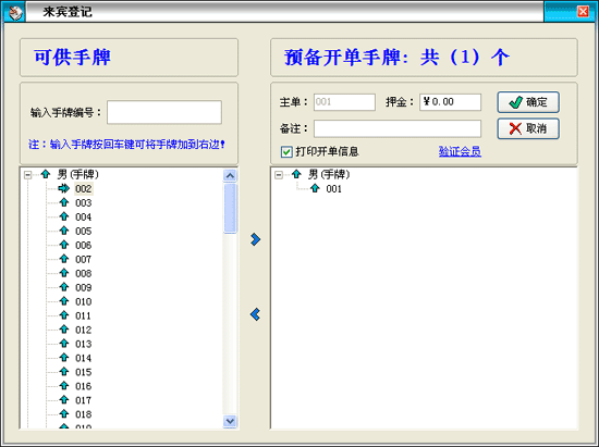 | 手牌:手牌可分為男賓手牌和女賓手牌,每個(gè)手牌就具體到某一來店登記的賓客,一般把手牌提供給一個(gè)客人后,在當(dāng)前客人未退出占用狀態(tài)前暫時(shí)無法提供給另一個(gè)客人消費(fèi)。此項(xiàng)目在系統(tǒng)設(shè)置中設(shè)置,在賓客開單時(shí)使用。